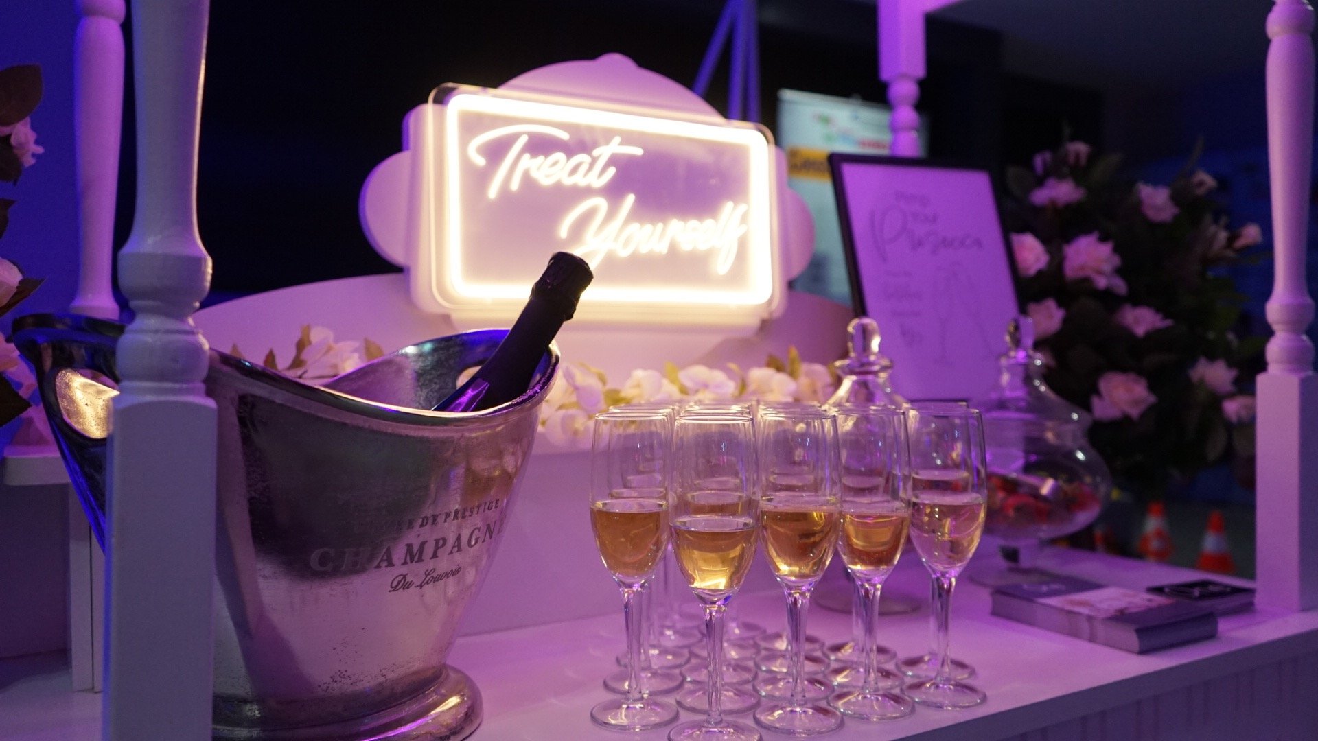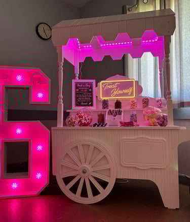 Beautifully decorated cart filled with sweet or prosecco for guest's to treat themselves.